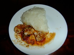 James` Frau (ich habe keine Ahnung, wie man ihren Namen ausspricht) war der Meinung, dass ich Sadza unbedingt einmal probieren müsse. Also brachte sie mir in der ersten Woche abends eine kleine Portion von ihrem Abendessen vorbei. Erwartungsvoll stand sie vor mir, hielt mir den Teller unter die Nase. Ich nahm den Teller entgegen, musterte den Maisbrei, er roch nach nichts. Netterweise hatte James` Frau mir auch etwas von ihrem Hühnchen dazugelegt. Ich fand diese Geste sehr nett, ich wusste, dass sich die Familie das Fleisch kaum leisten konnte.