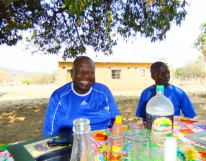 Nach 160 Kilometern und etwa zweieinhalb Stunden Autofahrt erreichte ich endlich das Dorf, in dem Nelson für die Fußball-Ausbildung zuständig war. Die Sonne brannte vom Himmel, es war gerade 13 Uhr, Zeit fürs Mittagessen. Also fuhr ich an der Schule vorbei, Nelson war mit Sicherheit schon zu der „Kantine“ gefahren, in dem er jeden Tag ein kostenloses Essen bekam. Als ich bei dem Haus ankam, an dem das Essen ausgegeben wurde, war Nelson leider noch nicht da. Ich fuhr zurück, parkte auf dem Schulhof, wo Nelson mir bereits mit ein paar anderen Männern entgegen kam. Gemeinsam fuhren wir zu dem provisorisch errichteten Imbiss zurück, setzten uns an einen Tisch, der für uns draußen im Schatten eines Baumes aufgestellt worden war.